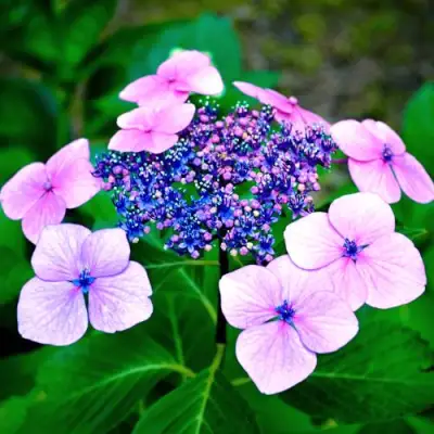 Гортензия пильчатая Блюберд (Hydrangea serrata 'Bluebird') – это изысканный сорт японской селекции, который славится своим очень впечатляющим, многоцветным цветением. Этот сорт, относящийся к виду пильчатых гортензий, растет средними темпами, формируя компактный куст с густой и округлой кроной. Гортензия Блюберд достигает высоты и диаметра около 150 см, что делает ее идеальной для одиночных, групповых посадок, бордюров, а также для выращивания в контейнерах.