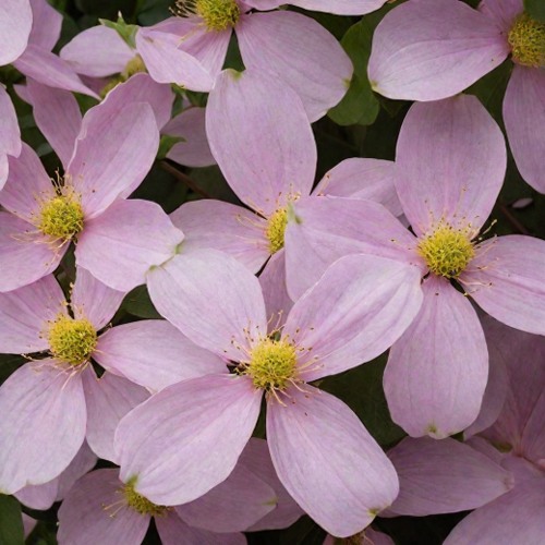 Весной клематис полностью меняет вид. На прошлогодних побегах распускаются сотни мелких звёздчатых цветков диаметром около 4–6 см. Оттенки варьируются от бело-розовых до нежно-розовых, а полупрозрачные лепестки подчёркивают лёгкость и свежесть цветения. В условиях Беларуси основной пик наступает в конце мая — это время, когда сад только набирает краски, и клематис становится одним из первых ярких акцентов. Цветение продолжается несколько недель, выглядит очень насыщенно и заметно выделяет участок среди ещё не полностью расцветших растений. У ряда сортов чувствуется мягкий сладковатый аромат.
