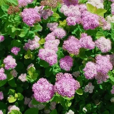 Листья спиреи вытянуто-овальной формы с зубчатым краем отличаются насыщенным зеленым оттенком, который меняется в зависимости от времени года. Это привносит дополнительный интерес в оформление сада, создавая контраст с другими растениями. В весенне-летний период каждый куст украшен светло-розовыми цветами, собранными в щитковидные соцветия, что делает его настоящей звездой вашего участка. Спирея цветет в среднем с мая по июнь, но при правильной обрезке отцветших соцветий, может порадовать вас повторным цветением в конце лета.