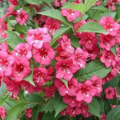 Листки вейгелы обладают насыщенной зеленой окраской и зубчатой каемкой. Пластины остаются на кустарнике практически до конца осени. Культура обладает хорошей морозоустойчивостью и способна выдерживать понижение температуры практически до -35 градусов. Гибридная вейгела способна прожить практически до 50 лет.