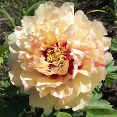 Цветы пиона — это настоящая жемчужина! Полумахровые бутоны имеют крупный размер с диаметром от 16 до 20 см. Изначально цветение происходит в светло-бежевом тоне, который со временем переходит в мягкий желтый с темно-красными пятнами у основания лепестков. Каждый цветок может отличаться — некоторые обладают бриллиантовым блеском, в то время как другие остаются в светлых тонах. Лепестки слегка волнистые и нежные на ощупь, а сладкий аромат добавляет особую изюминку. Стойкость в срезке составляет 7-10 дней, что делает этот сорт идеальным для создания букетов.