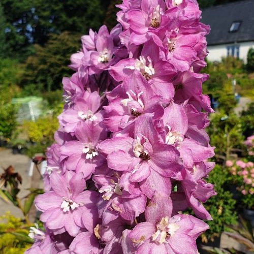 Высокий и стройный, дельфиниум Астолат достигает 140–160 см, при этом сохраняет компактную ширину куста до 60–70 см. Стебли прямостоячие, прочные, увенчаны длинными кистями соцветий, плотно усыпанных крупными махровыми цветками диаметром 5–7 см. Их цвет — благородный розово-сиреневый, с переливами лавандового и приглушённым кремовым центром — словно сходит с полотен акварелистов.