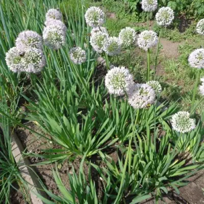 В июле появляются округлые соцветия — плотные зонтики бело-сиреневых оттенков. На высоком цветоносе шар диаметром до 6 см смотрится воздушно и ярко. Цветение длится около месяца, привлекая полезных насекомых, особенно пчёл. Аромат — лёгкий, луково-медовый. Хорошо вписывается в натуралистические и функциональные сады.