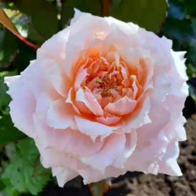 Цветение продолжается с начала июня до середины осени. Бутоны раскрываются последовательно, каждый держится до 10 дней. Цветок густомахровый, около 120 лепестков, диаметром до 12 см. Лепестки плотные, хорошо держат форму и не выгорают на солнце. Окрас — сложный и нестабильный: утром — холодный розовый, вечером — тёплый персиково-пудровый. На одном кусте часто сочетаются разные оттенки, что делает цветение визуально динамичным.